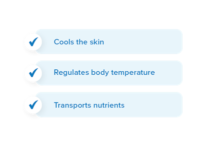 Water facilitates functions that are essential for survival, such as breathing, transporting nutrients, regulating body temperature and cooling the skin. Without sufficient water, these functions cannot take place.